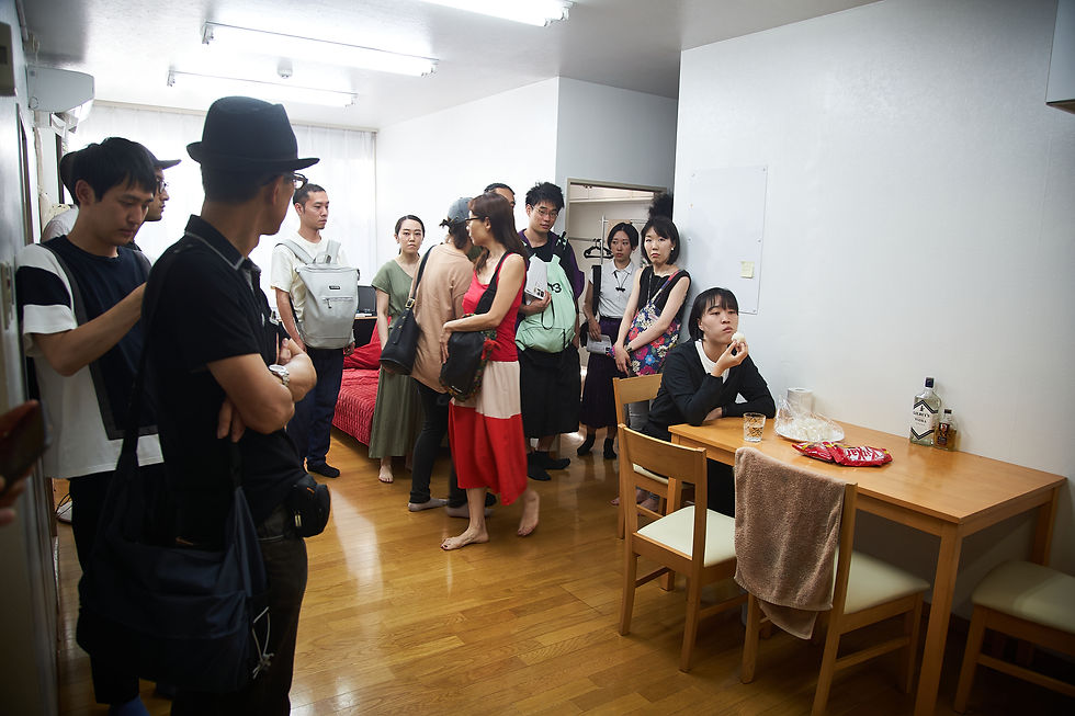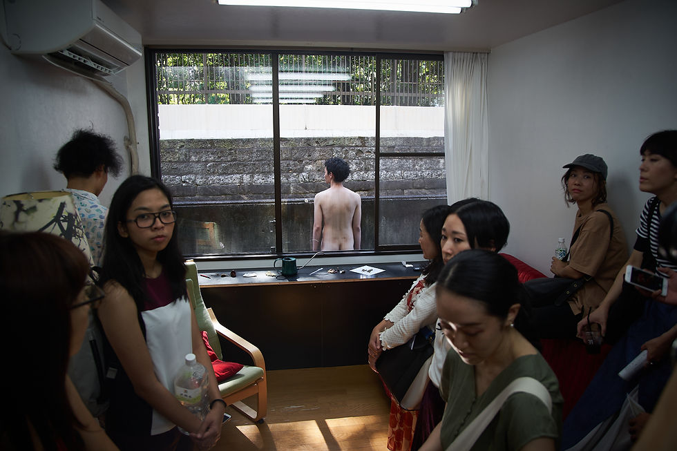 Goethe-Institut Tokyo and Kobayashi invited young artists who explore the performance. It was 1-week-long experimentation with performance art academically with programs including workshop, preparation, performance showing and feedback discussion. This program brings significant meaning to the representation of the body within an academic platform, to develop methods to enter radical performances educationally and to reconsider its importance as a new medium of contemporary art practice. We will be discussing the curation of performance-based exhibition, documentation and archive, the position of performance as a medium now in university, museum, art fair and biennale, etc. Stilllive is becoming a significant platform for looking back in the history of past movements for archiving performances which usually disappear in live but also are remaining into the future through this platform. In the performance, Kobayashi used an apartment, cafe terrace and theater hall, with artists and audiences were able to freely roaming around these three different spaces.